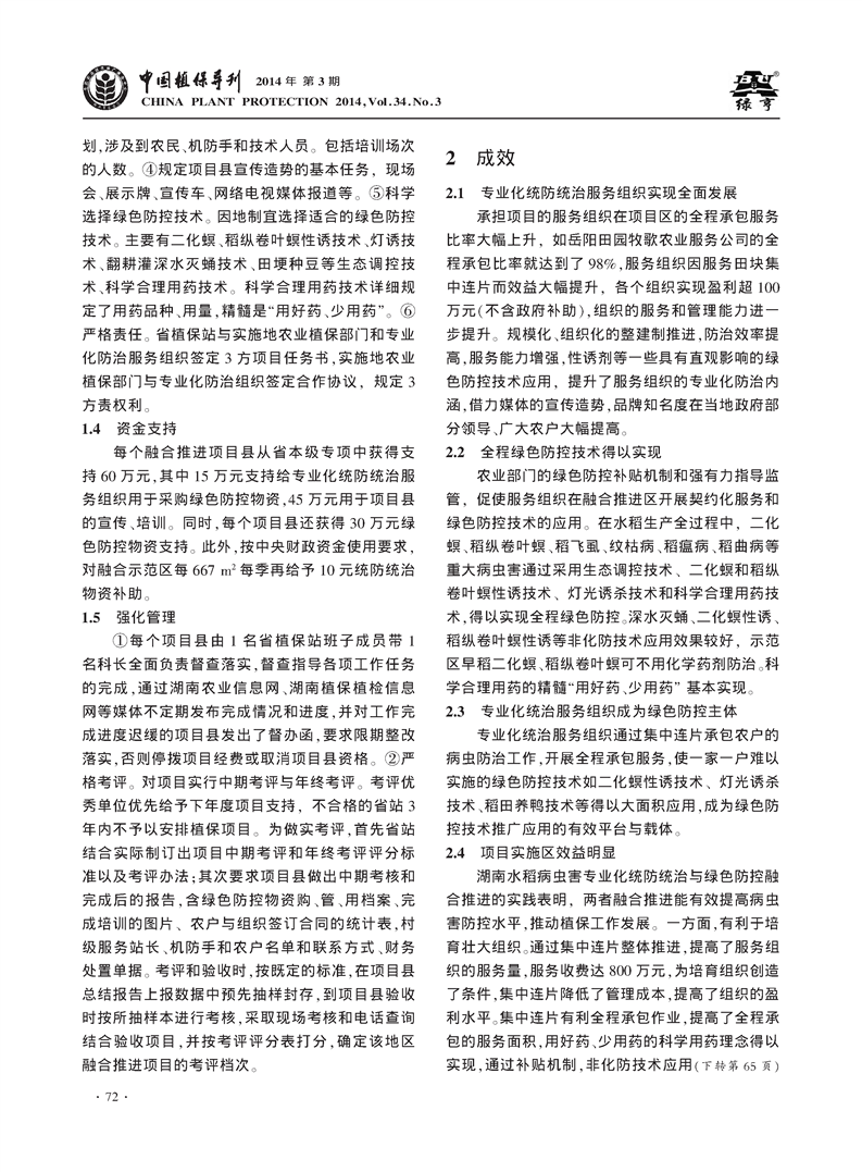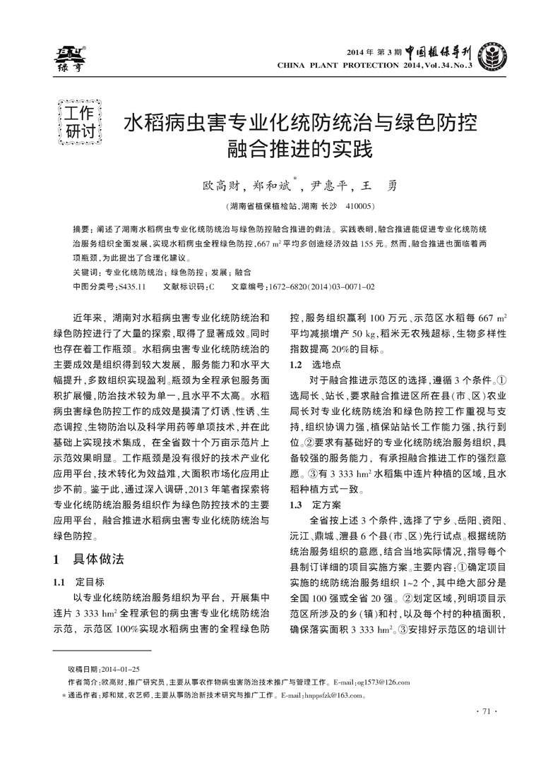 水稻病虫害专业化统防统治与绿色防控融合推进的实践