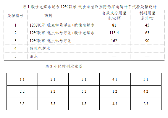 酸性电解水(四川雄一农业科技服务有限责任公司);12%联苯·吡虫啉悬浮剂(江苏龙灯化学有限公司)。