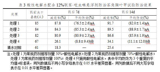 酸性电解水配合12%联苯·吡虫啉悬浮剂施用对防治茶角胸叶甲有较好的防治效果。在减少30%常规用量的基础上配合施用其防效优于常规药剂用量。但在减少50%常规用量的情况与之配合,防效比常规用量100%略差,说明酸性电解水配合12%联苯·吡虫啉悬浮剂施用防治茶角胸叶甲可减少12%联苯·吡虫啉常规用量30%-50%的使用量。