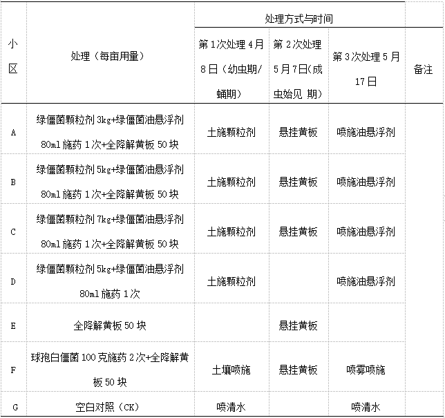 (3) 第三次处理:5月17日,进行第二次施药,处理A、B、C、D用绿僵菌油悬浮剂兑水进行喷雾施药;处理F用球孢白僵菌喷雾施药;对照区喷清水。