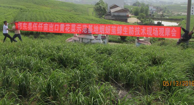 2016年是祁东争创“中国.祁东2016黄花菜节”和“创建出口食品农产品质量安全示范区”的两创活动年,县委县政府高度重视农作物病虫害绿色防控工作,县委常委、副县长周跃军直接抓。为推动黄花菜出口基地应用病虫害绿色防控技术,推行农药减量行动,县财政在十分困难的情况下拿出约35.2万元给予支持,其中采购高效药剂和药械10万元,采购太阳能灭虫灯和诱虫黄板25.2万元,专门指定县植保局和蔬菜办协助抓好示范区的田间管理。县政府组织召开病虫害绿色防控专题会议,周副县长作了工作部署,指出病虫害绿色防控是实现农业部农药减量、杜绝违禁高毒农药施用和确保农产品质量安全的一个重要抓手,对于高新环保产品要大胆进行试验和示范;在试验示范的基础上稳步推广。5月13日召开了由县委和政府领导参加的“祁东县石龙桥黄花菜出口基地释放烟蚜茧蜂生防技术现场观摩会”,并计划在官家嘴石龙桥生产基地推行无人植保飞机施药。