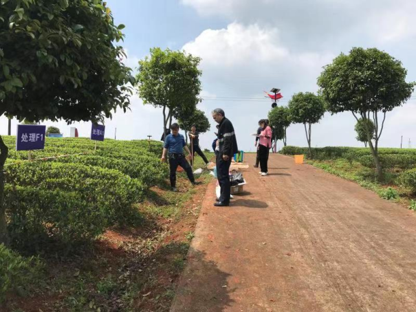 调研组一行在听取望城区植保部门关于乌山贡茶基地开展金龟子绿僵菌与全降解黄板集成防治茶角胸叶甲试验示范的情况介绍后,深入到试验示范基地进行实地考察,并现场指导技术人员开展茶角胸叶甲幼虫基数调查与药剂撒施试验。