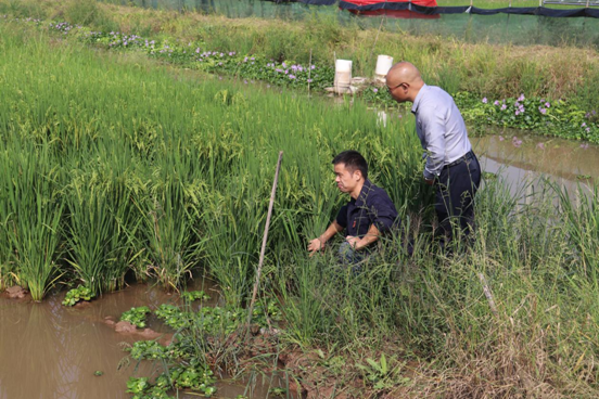 西湖区农业农村局植保站负责人(左一)在示范区察看水稻长势