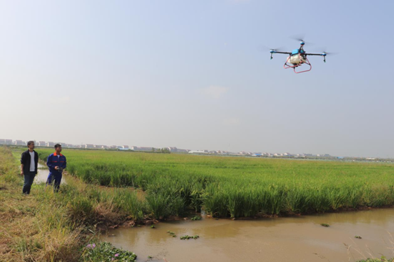 湖南三相丰隆飞防大队飞手正在示范区作业。