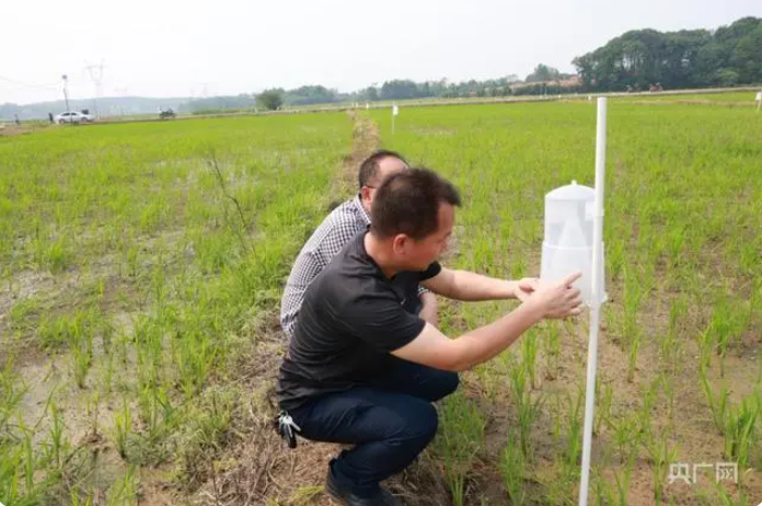 农技人员正在查看二化螟性诱捕器的使用效果(央广网发 周艳梅 摄)