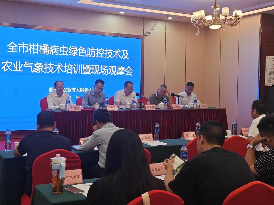 为进一步加强全市柑橘病虫绿色防控工作,增进农业气象技术对柑橘种植生产指导,全力保障柑橘产业安全,9月25日-26日,衡阳市在常宁市举办全市柑橘病虫害绿色防控技术及农业气象技术培训暨现场观摩会。本次会议由衡阳市农业技术服务中心与衡阳市气象局共同举办,各县市区植保植检站负责人、气象局业务骨干,柑橘种苗生产者及柑橘种植大户等70余人参加培训。