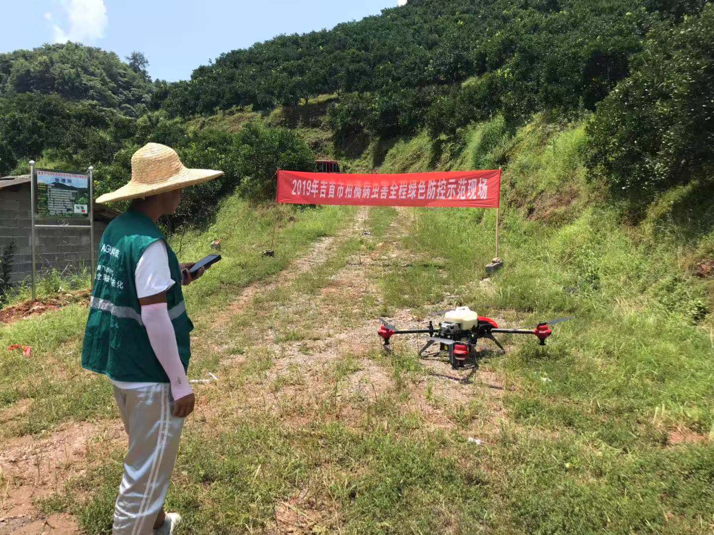 在推进柑橘绿色防控工作中,融合推进农作物病虫害专业化统防统治工作,授权金红土富硒椪柑专业合作社与湘西极飞无人机公司,采用无人机与电动喷雾器空地联合统防新模式,即在坡度不大,空中没有障碍物的区域开展无人机统防,坡度大、空中障碍物多的区域开展机防手统防,极大地提高了防控效率,切实解决了山区作物病虫害防治难的问题。同时,为探索出符合吉首市柑橘最佳病虫害防控措施,核心示范区内开展砂皮病不同药品,不同防治方式(无人机与人工)处理对比试验,定期跟踪数据调查,总结探索新的防控新模式,为产业振兴贡献植保力量。