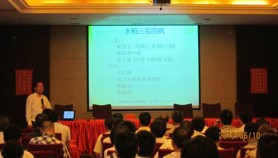6月10日,桂阳县举办了绿色防控技术培训班,副县长龚茂礼、县农业局局长罗邦富出席会议并作讲话,湖南农业大学教授、大方植保有限公司总经理何可佳、市植保植检站站长钟造雄、推广研究员刘贵芳先后在培训班上讲课。全县38个乡镇农技人员、农资经销商、专业合作社服务组织负责人、部分种植大户等共180余人参加了培训。水稻病虫害绿色防控技术、科学用药技术、如何避免购买假劣农药等课程深受学员欢迎。