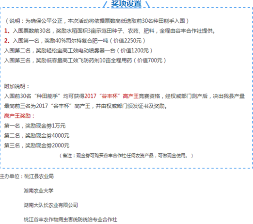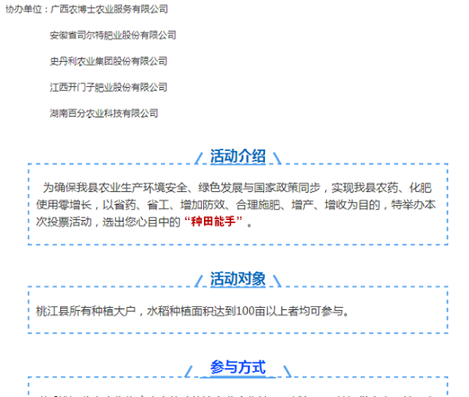 为全力推进农药零增长行动,促进全县农业绿色发展,桃江县以“减量控害、绿色增产”为主题,以“稳粮增收、提质增效”为目标,创新工作方式,大力宣传“公共植保、绿色植保、科学植保”理念。县农业局拟与湖南农业大学、广西农博士、安徽司尔特、桃江谷丰农作物病虫害统防统治专业合作社联合举办“我是种田能手”系列活动。