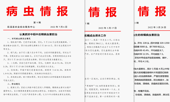 一、加强测报调查。植保机构通过开展农作物病虫害系统调查和面上普查,及时掌握病虫害发生动态是指导病虫害大面积防治的基础。辰溪县主要从三方面入手抓牢抓实抓好这项工作:一是稳定植保队伍,县植保机构安排3名植保高级农艺师组成专家团队,各乡镇确保1名专职植保技术人员构建植保网络体系,确保活有人干、事有人管,为精准测报提供人员和技术保障;二是科技支撑,以辰溪县农业有害生物预警与控制区域站为基础,及时检修、维修、更新监测设备,保持监测设备的先进性及顺畅运行,为精准测报提供科技设备保障;三是经费保障,根据《农作物病虫害防治条例》及《农作物病虫害监测与预报管理办法》,辰溪县稳定增加经费投入,为精准测报提供保障。