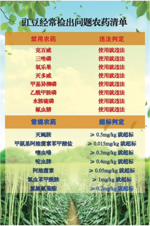 植保技术人员要主动对接生产主体,深入田间地头,面对面开展全程技术指导,指导生产主体科学防控。针对农药使用突出问题,尤其是豇豆经常检出的禁用农药和常规农药超标问题,强化科学安全用药指导,严禁使用禁用农药,不超范围使用农药,坚持达标防治、对症下药、适时适量用药,轮换用药,严格执行农药安全间隔期,做好用药记录归档。坚决杜绝使用克百威、毒死蜱、三唑磷、氧乐果、灭多威、甲基异柳磷、乙酰甲胺磷、水胺硫磷、氟虫腈等禁限用农药,严格控制噻虫嗪、灭蝇胺、啶虫脒、甲氨基阿维菌素苯甲酸盐、阿维菌素、氯虫苯甲酰胺、氯氟氰菊酯、倍硫磷等常规农药使用频次。
