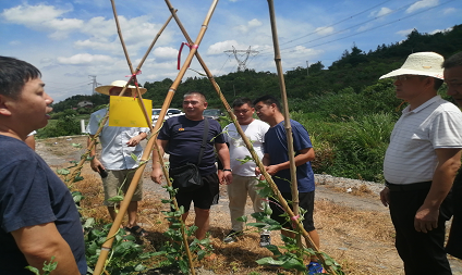 8月23日,零陵区农业农村局局长杜中运、副局长盛清武到邮亭圩镇乡村振兴示范村马鞍岭村豇豆生产基地调研指导生产和病虫害防治。