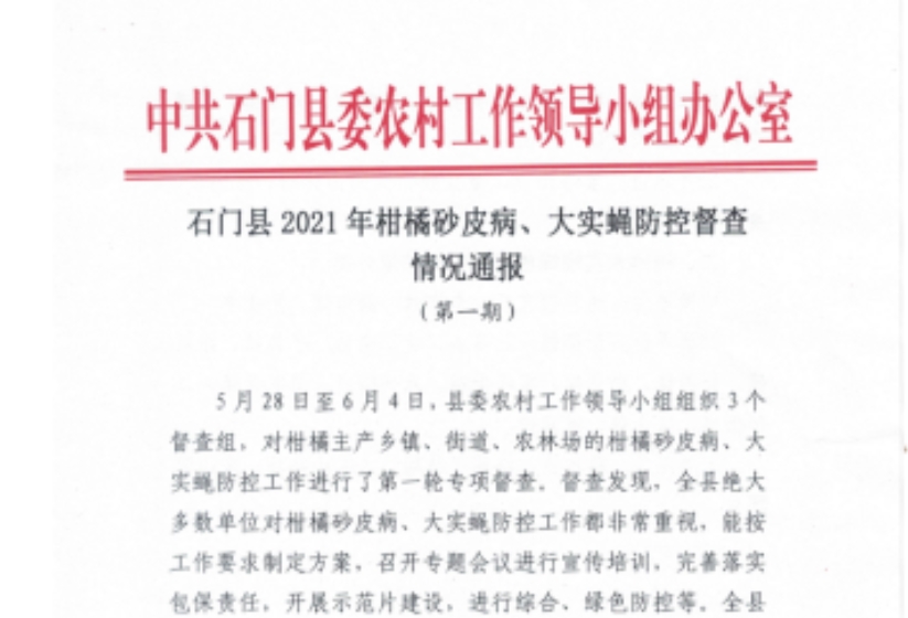 柑桔大实蝇对柑桔生产危害大,导致轻则减产、重则绝收,柑桔砂皮病影响果实外观品质,导致柑桔价格大幅下降,极大挫伤果农生产积极性,柑桔这“一虫一病”严重威胁柑桔产业健康发展。为此,石门县通过全力推进柑桔重大病虫绿色防控,实现农药减量增效,助推农业绿色发展。
