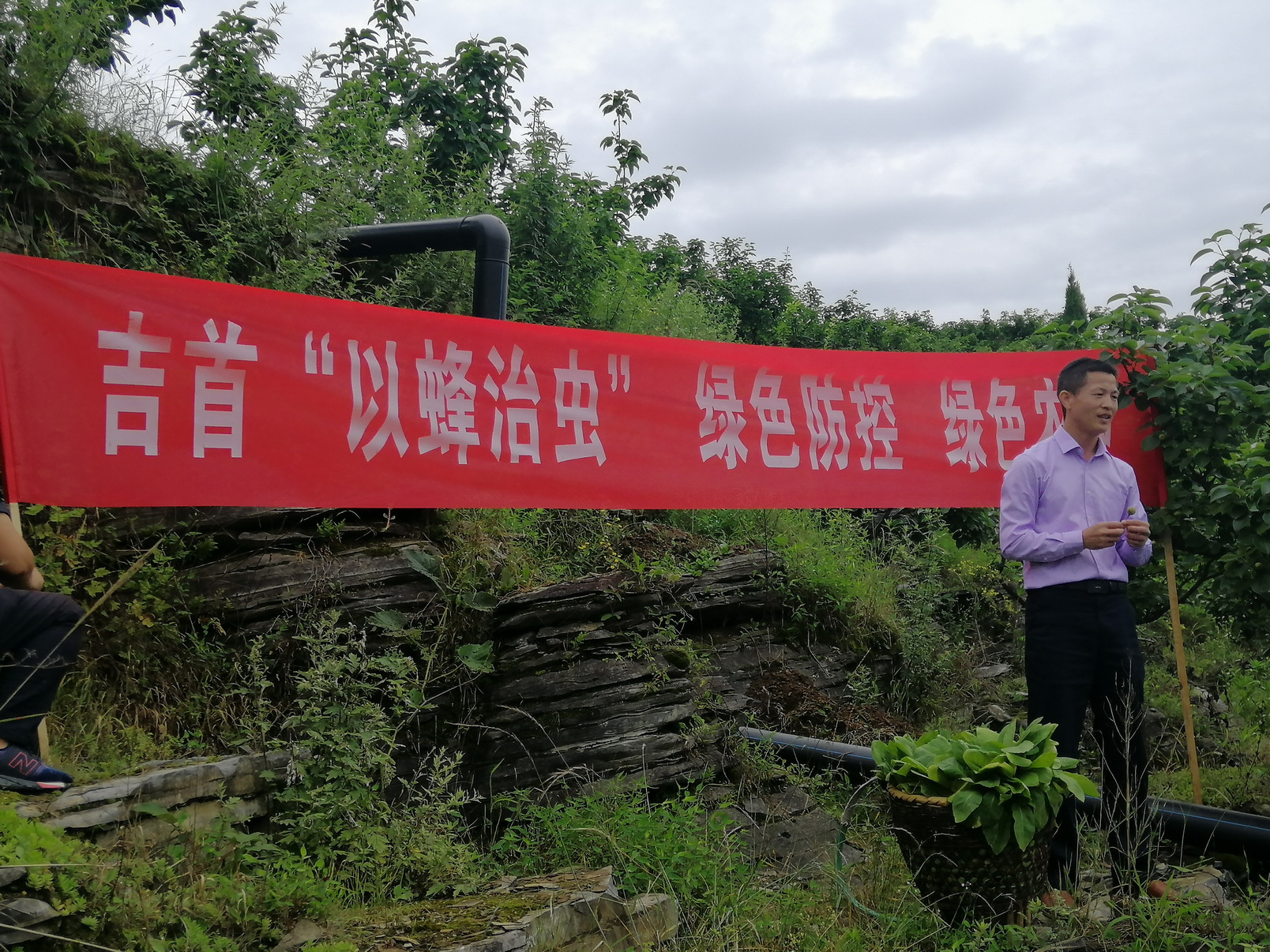 吉首市植保局局长时明刚讲解以蜂治虫的作用并组织现场放蜂