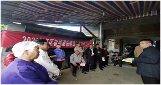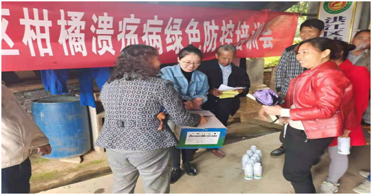4月28日,洪江区植保植检站站长何泽安在桂花园乡茅头园村8组、9组为柑橘种植户培训柑橘溃疡病绿色防控技术。培训会上,何站长讲授了柑橘溃疡病的发生规律和绿色防控技术,现场发放防治柑橘溃疡病的对口药剂2.4万元,还在桔园里现场指导种植户们修剪、施肥等防控柑橘溃疡病的农业措施。
