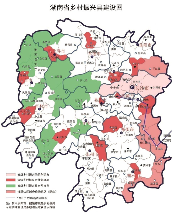 建设湘赣边乡村振兴示范区。按照“省级统筹、市县主体,先行先试、示范引领,分类推进、重点突破”的原则,实施现代农业发展示范工程、农业产业强镇和特色小镇培育工程、农村人居环境示范工程、水利建设示范工程。分类推进乡村振兴示范,浏阳市和醴陵市打造率先全面推进乡村振兴样板区,攸县打造梯次推进乡村振兴样板区,平江、桂东、茶陵、炎陵、汝城、安仁、宜章7个县打造巩固拓展脱贫攻坚成果同乡村振兴有效衔接样板区。