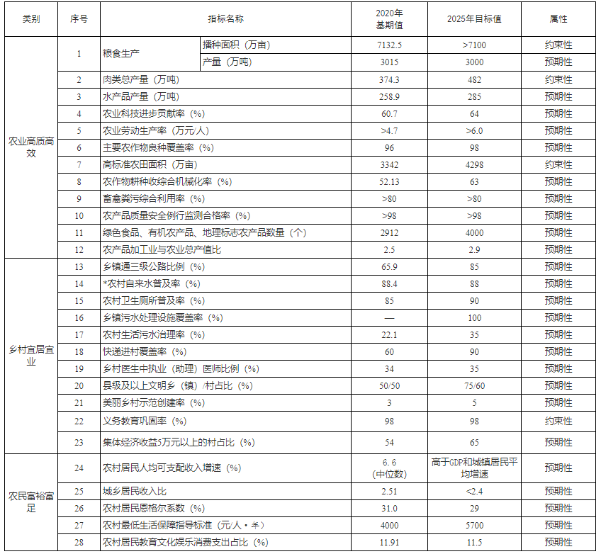 到2025年,农业农村现代化取得重要进展,在中部地区率先基本构建现代农业产业体系、生产体系和经营体系,初步形成以设施化、园区化、融合化、绿色化、数字化为主要特征的农业现代化;农村基础设施和基本公共服务水平明显提高,农民全面发展能力显著增强,党组织领导的乡村治理体系不断健全,初步形成以生态宜居、治理有效、乡风文明为主要特征的农村现代化。