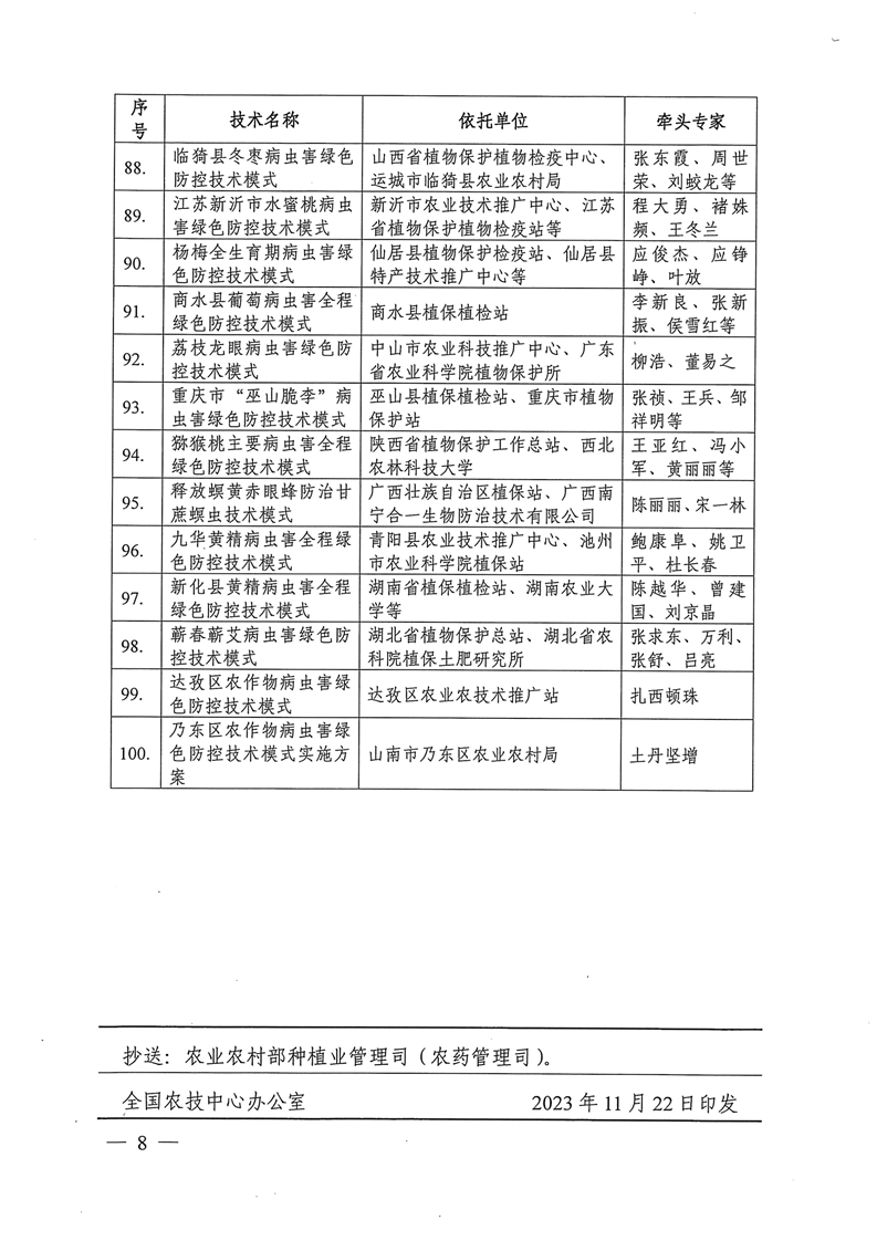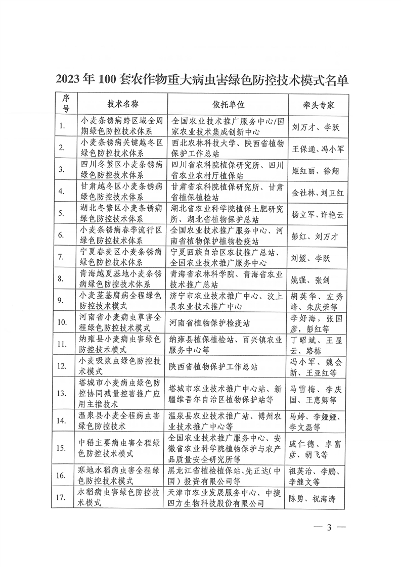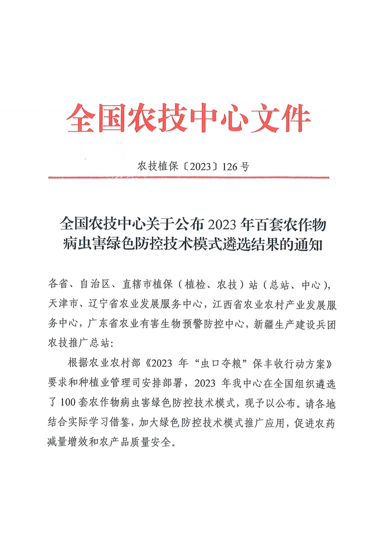 全国农技中心关于公布2023年百套农作物病虫害绿色防控技术模式遴选结果的通知