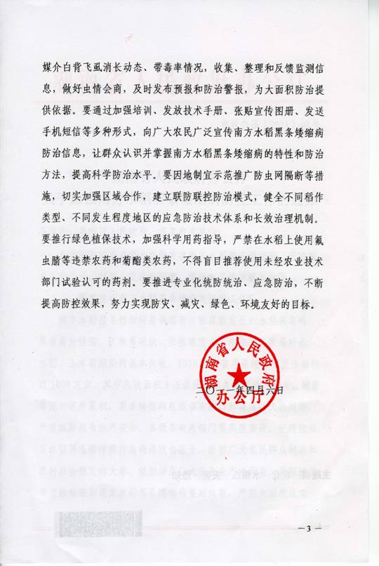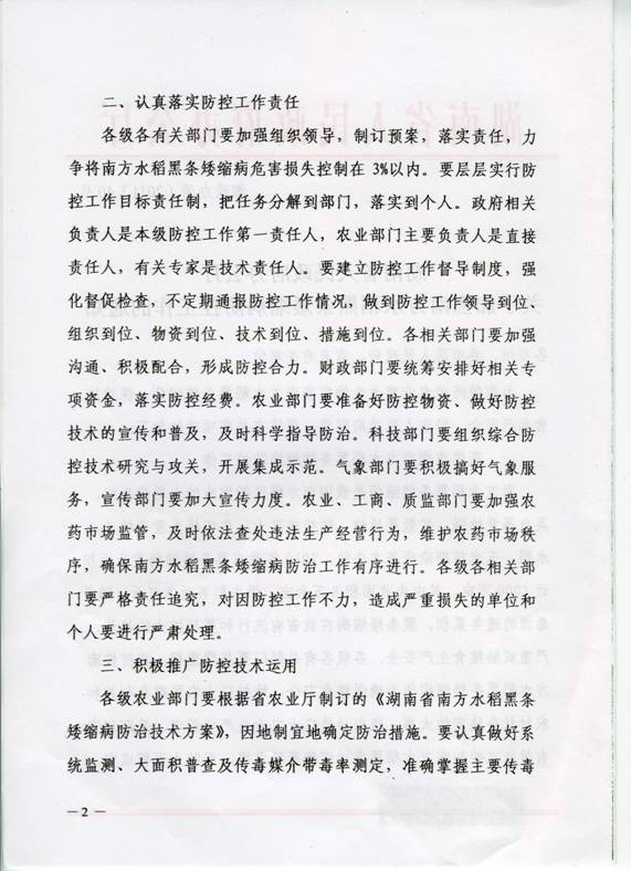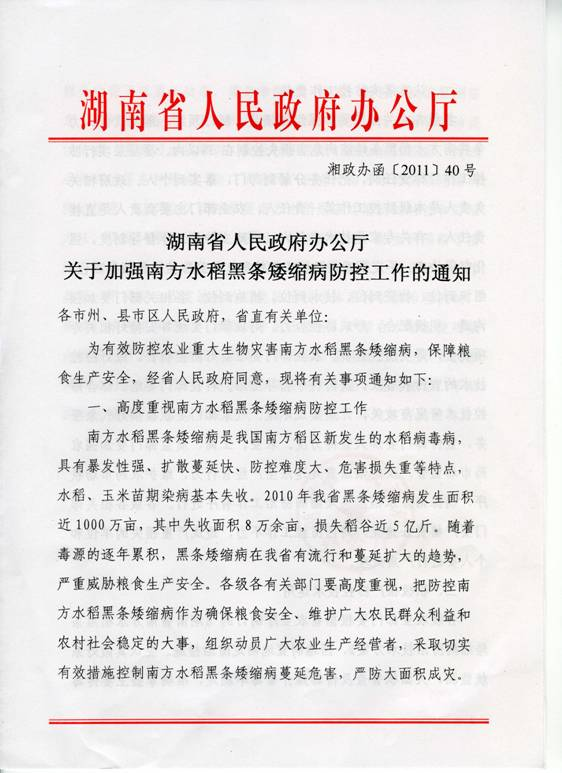 湖南省人民政府办公厅关于加强南方水稻黑条矮缩病防控工作的通知