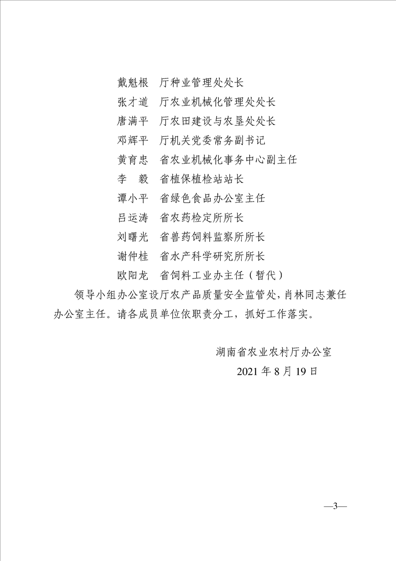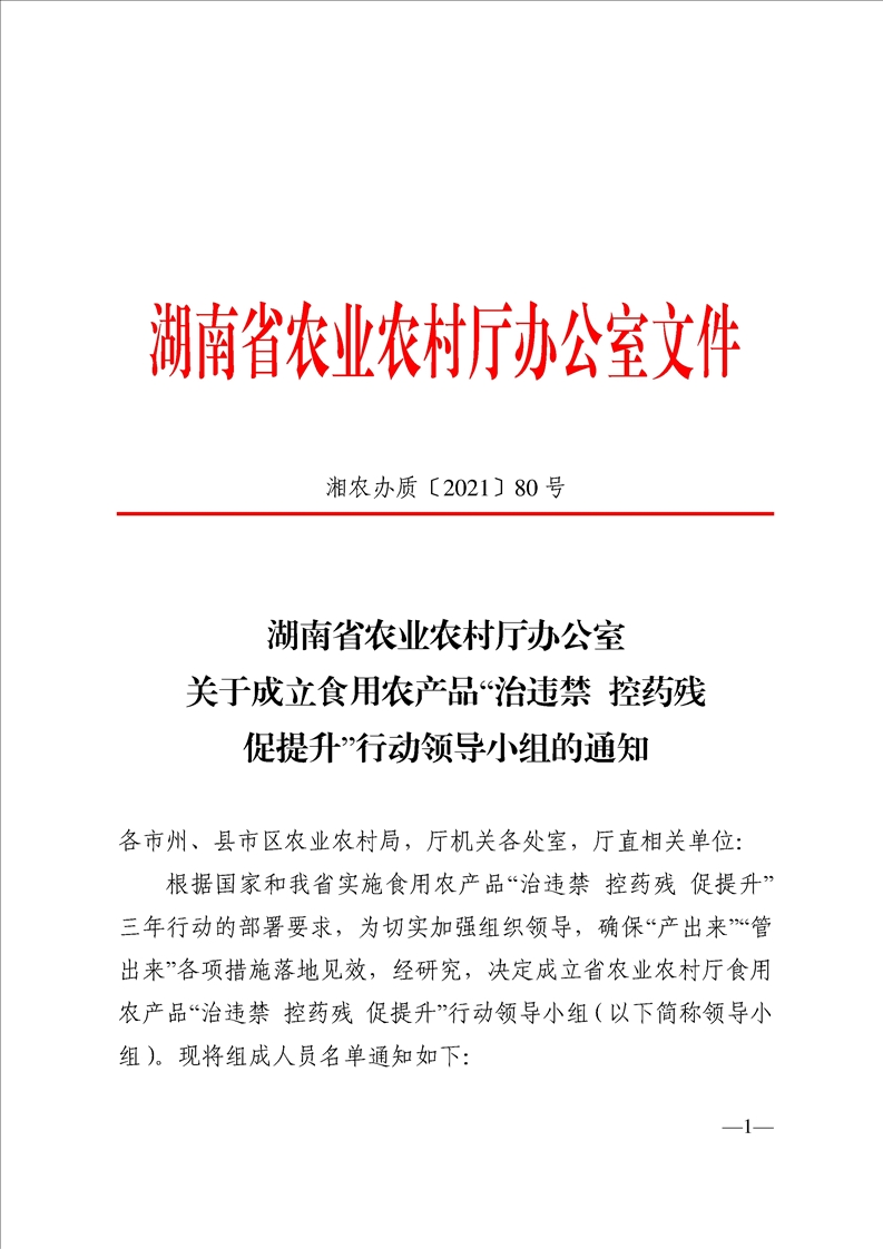 湖南省农业农村厅办公室关于成立食用农产品“治违禁控药残促提升”行动领导小组的通知