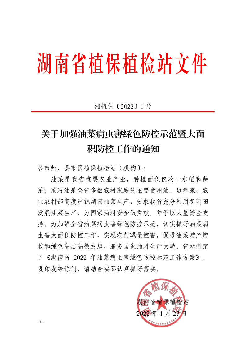 关于加强油菜病虫害绿色防控示范暨大面积防控工作的通知