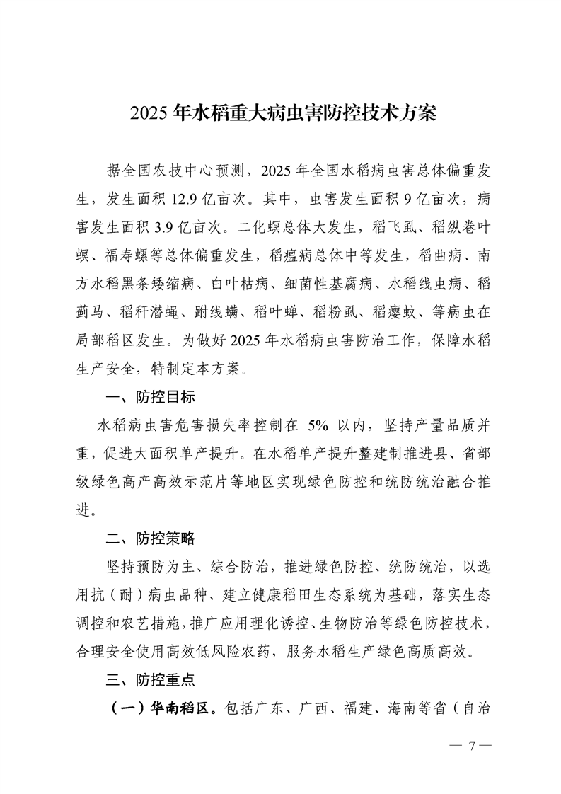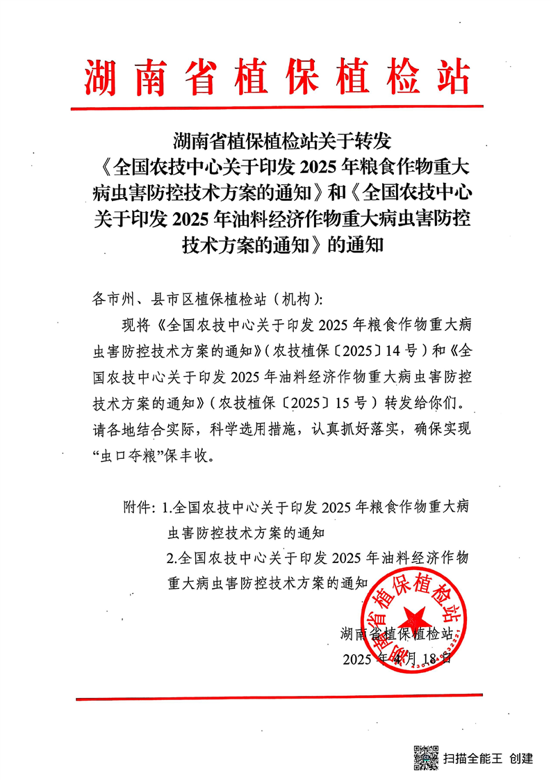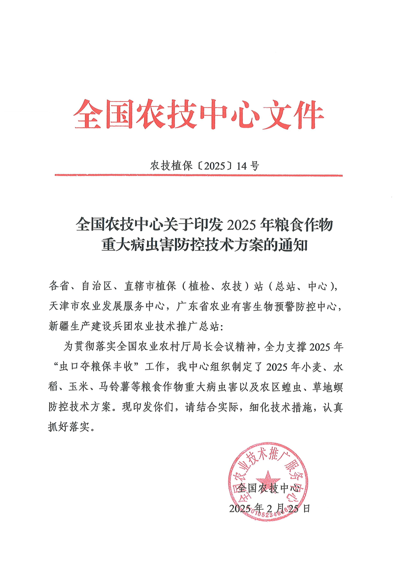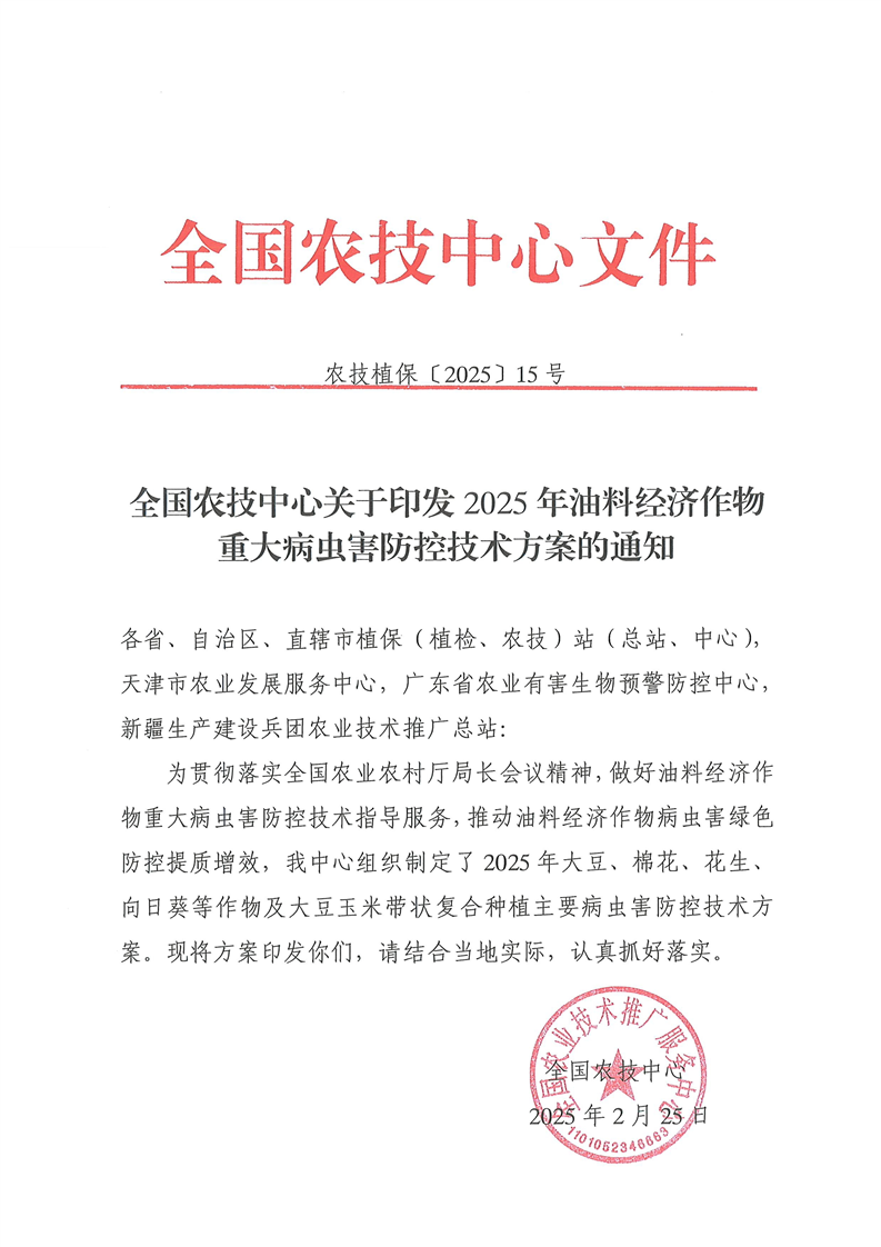 关于转发《全国农技中心关于印发2025年粮食作物重大病虫害防控技术方案的通知》和《全国农技中心关于印发2025年油料经济作物重大病虫害防控技术方案的通知》的通知