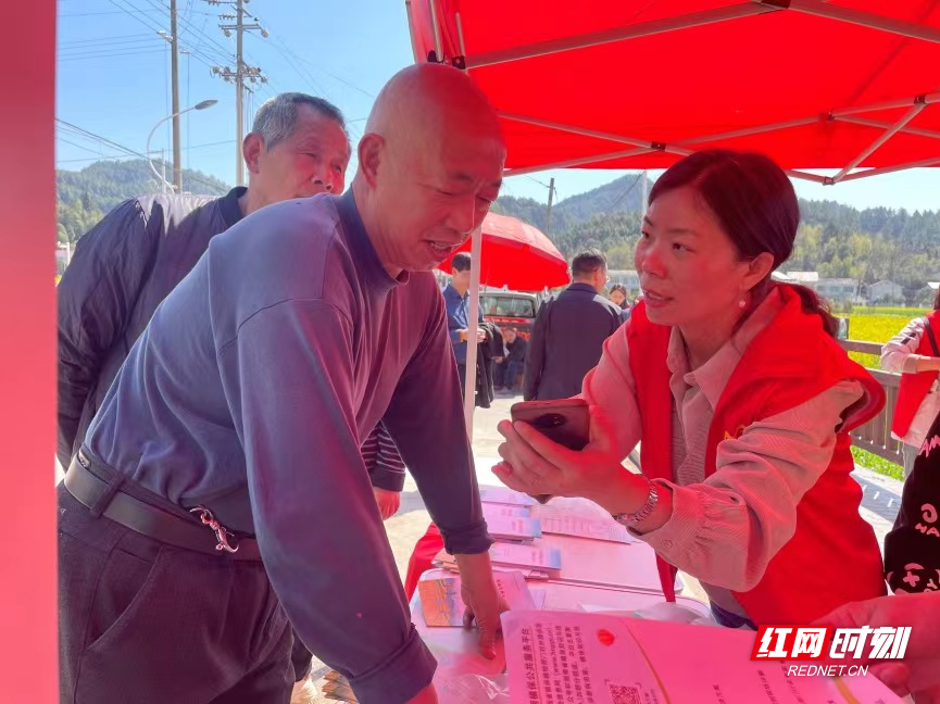 另一边,红色志愿者们正在发放病虫害技术资料、绿色防控物资及高效低毒低残留对环境友好的药剂,并手把手指导使用。为解决植保服务最后一公里问题,工作人员积极推广湖南植保APP,吸引农户不断前来驻足。