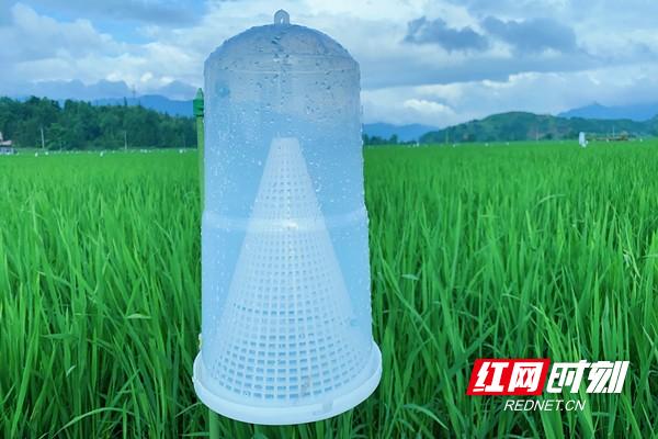 汝城县井坡镇双季稻生产示范基地安装的水稻螟虫诱捕器。