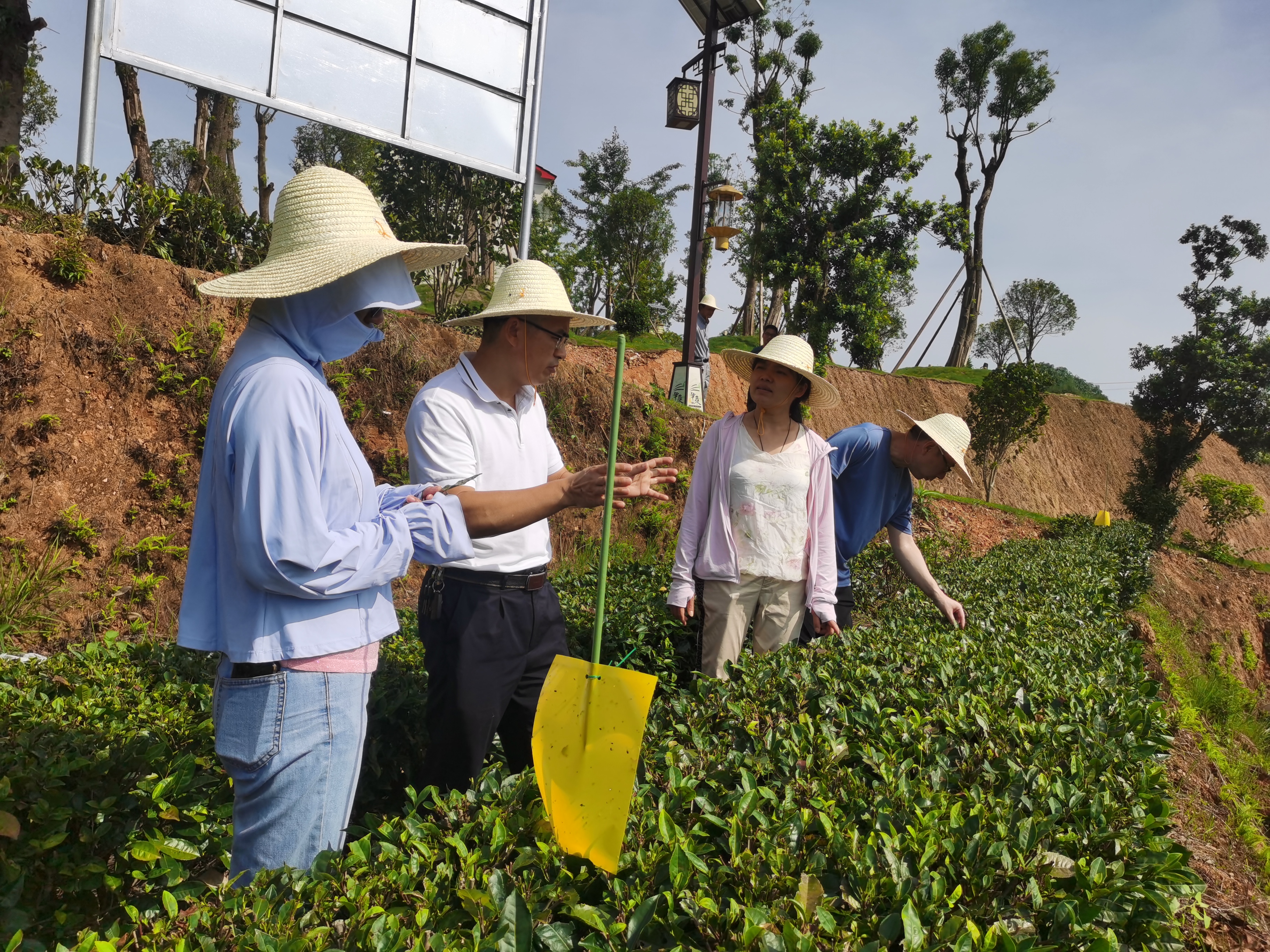 调研组一行先后来到灰山港镇甘泉山茶叶专业合作社和武潭镇华莱御园茶叶绿色防控示范基地实地调研,查看农业防治、理化诱控、生物防治等绿色防控技术措施防控效果,并与县农业农村局技术人员、茶叶基地负责人进行了深入交流,探讨如何因地制宜针对当地茶叶主要病虫害制定切实有效的绿色防控措施。