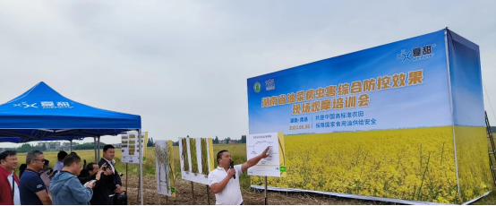 会议期间,与会代表还实地观摩了南县、安乡县油菜病虫害综合防控效果及测产现场。湖南省作物研究所郭一鸣副研究员介绍了湖南油菜生产状况,湖南农业大学朱宏建副教授讲授了油菜菌核病发生特点与综合防控技术。相关企业介绍了油菜防控新技术新产品相关情况。