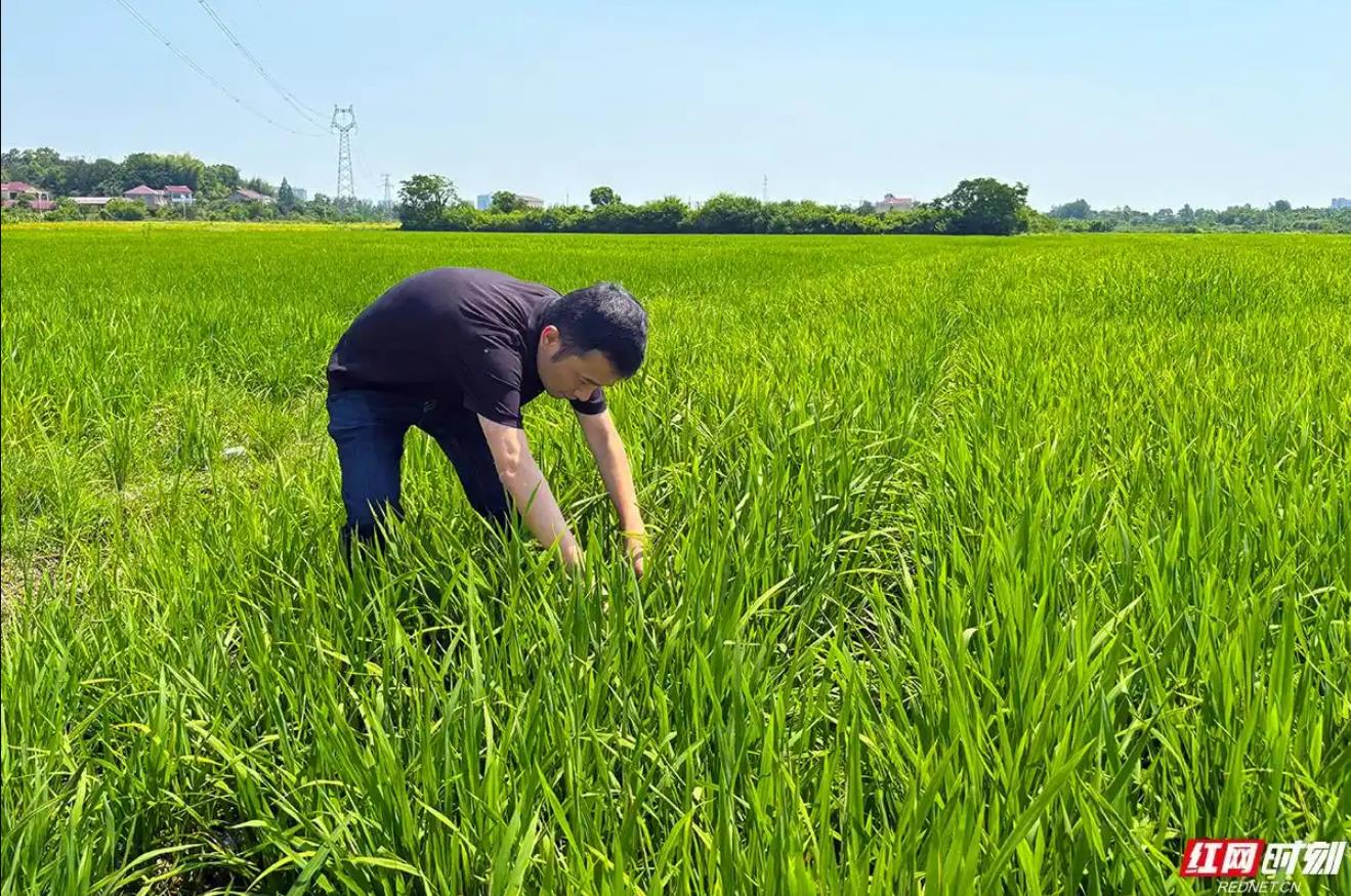 常德市璟农堂农业服务有限公司负责人肖勇查看水稻田病虫草害情况。