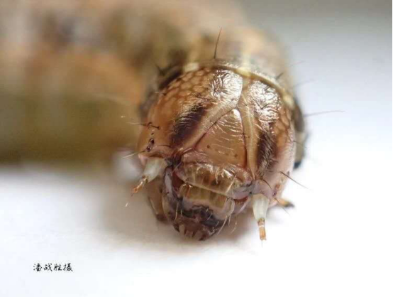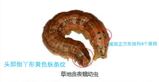 草地贪夜蛾幼虫头部具黄白色明显倒“Y”型斑,腹部未节有呈正方形排列的4个黑斑。为害症状:在玉米上,1-3龄幼虫隐藏在叶片背面和心叶取食,取食后形成半透明薄膜“窗孔”。4-6龄幼虫取食叶片后形成不规则的长形孔洞,严重时可造成玉米生长点死亡,影响叶片和果穗的正常发育,此外还蛀食玉米雄穗和果穗。