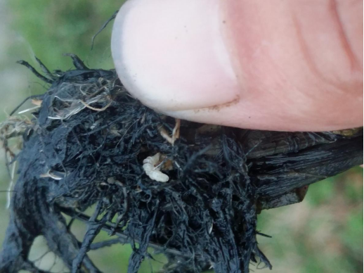 稻水象甲幼虫取食稻根,导致根系变黑或腐烂。