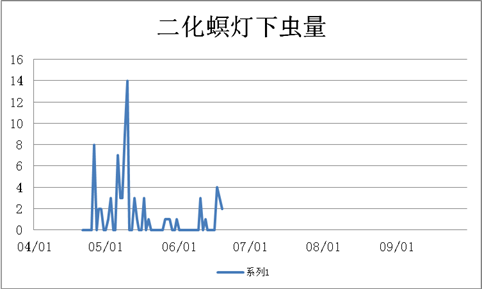(3)二化螟:5月9日虫量高峰后,6月17日出现小高峰。今年以来二化螟虫量为去年同期的48.8%;6月以来共13头,与去年基本相当。