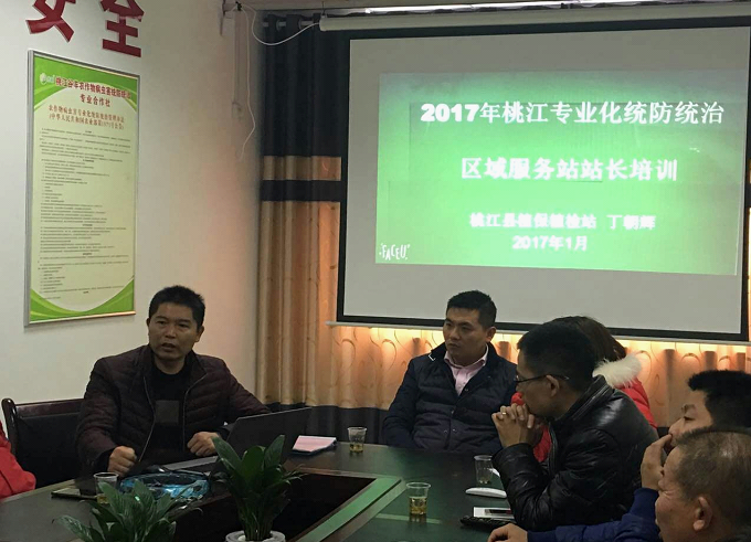 作为专业化服务组织开展病虫防治承包服务、宣传培训、技术咨询、防控物资存储、机械维修保养、服务合同签订和运行管理平台的负责人,区域服务站站长是服务组织开展专业化统防统治服务的骨干力量。为了提高站长履行各项工作职责的能力,做到职业化任职,确保承包服务的各个环节和细节落到实处,化解服务组织的各类风险,提升组织服务水平和能力,桃江将培训服务站长作为2017年专业化统防统治工作的开局。1月14日,桃江谷丰农作物病虫害统防统治专业合作社组织15名区域服务站站长进行了专业培训。培训会上,县植保站站长丁朝辉就先进植保机械的使用与维修、病虫害防治与绿色防控技术、服务站运营管理与台账规范化、农药废弃物回收等内容进行了详细讲解,并强调2017年桃江县将整合资金,重点扶持有发展潜力和规模的服务组织,着力构建和完善专业化统防统治这一新型植保社会化服务体系,发展专业化统防统治,推广绿色防控措施,树立样板典型,加强督导考核,提质扩面,纵深推进,带动全县统防统治与绿色防控工作的健康快速发展。