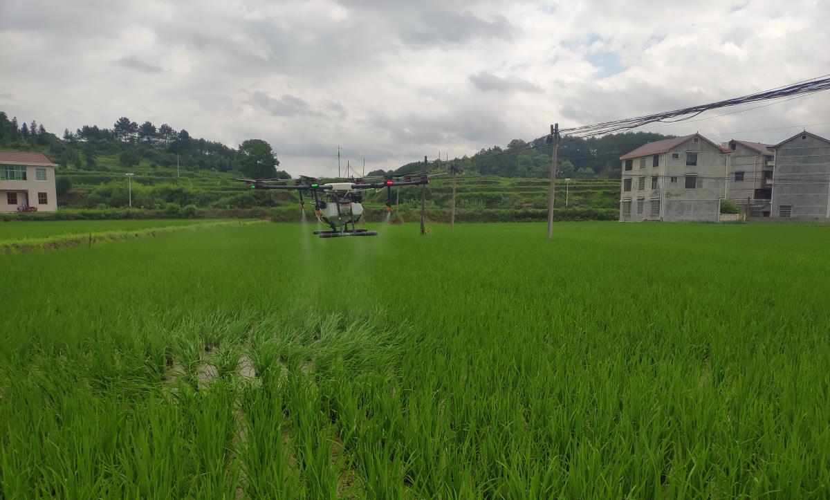 6月14日,在辰溪县后塘乡前塘村,一架植保无人机在水稻田上空来回穿梭进行施药作业。
