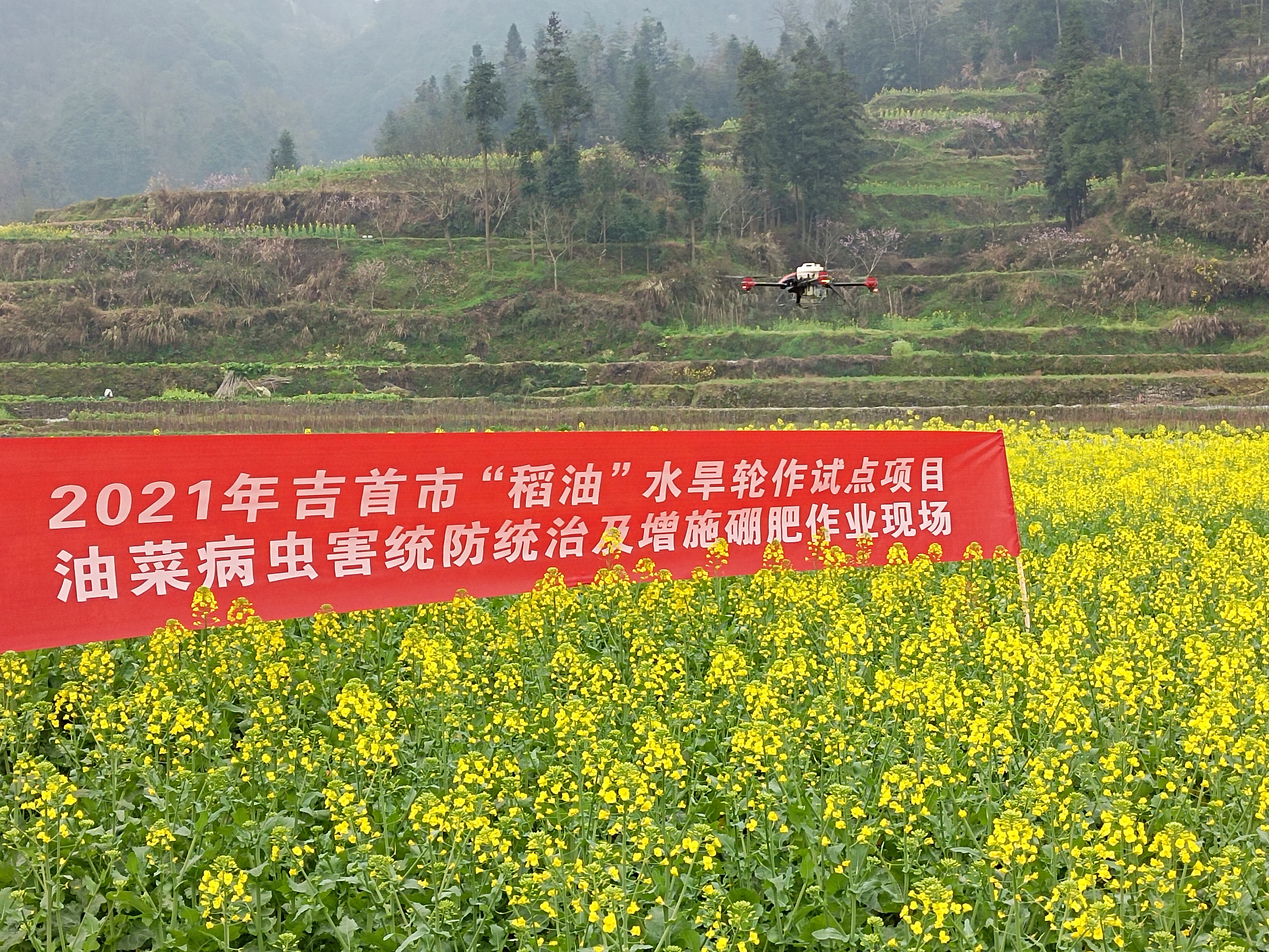 入春以来,气温回暖,油菜花陆续盛开,同时春季也是油菜病虫害高发期,防治好油菜病虫害,对于确保今年油菜丰产丰收至关重要。吉首市农业农村部门高度重视油菜病虫防治工作,2月24日,市农业农村局联系植保无人机专业服务公司对辖区内适宜区域油菜作物开展统防统治作业服务,打响了全市油菜病虫防治新年第一仗。本次统防统治主要防治油菜菌核病、霜霉病、蚜虫等病虫害。同时指导农户抓好春季油菜田间培管,及时清沟沥水,对叶面增施硼肥,确保今年油菜稳产高产。