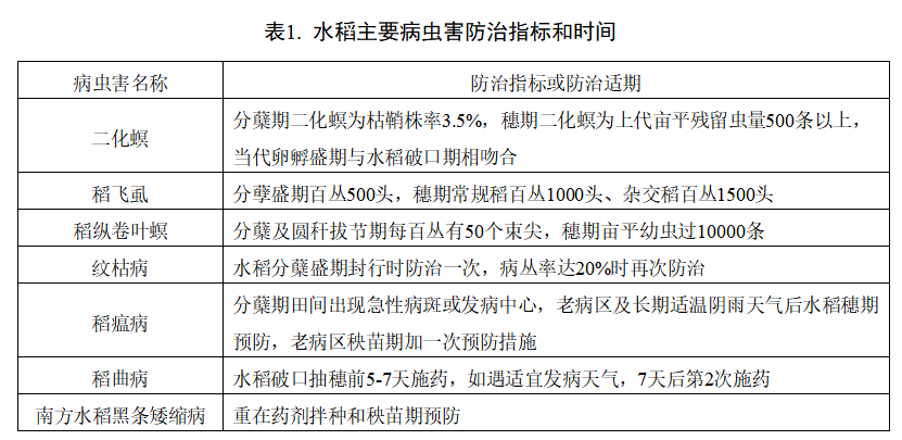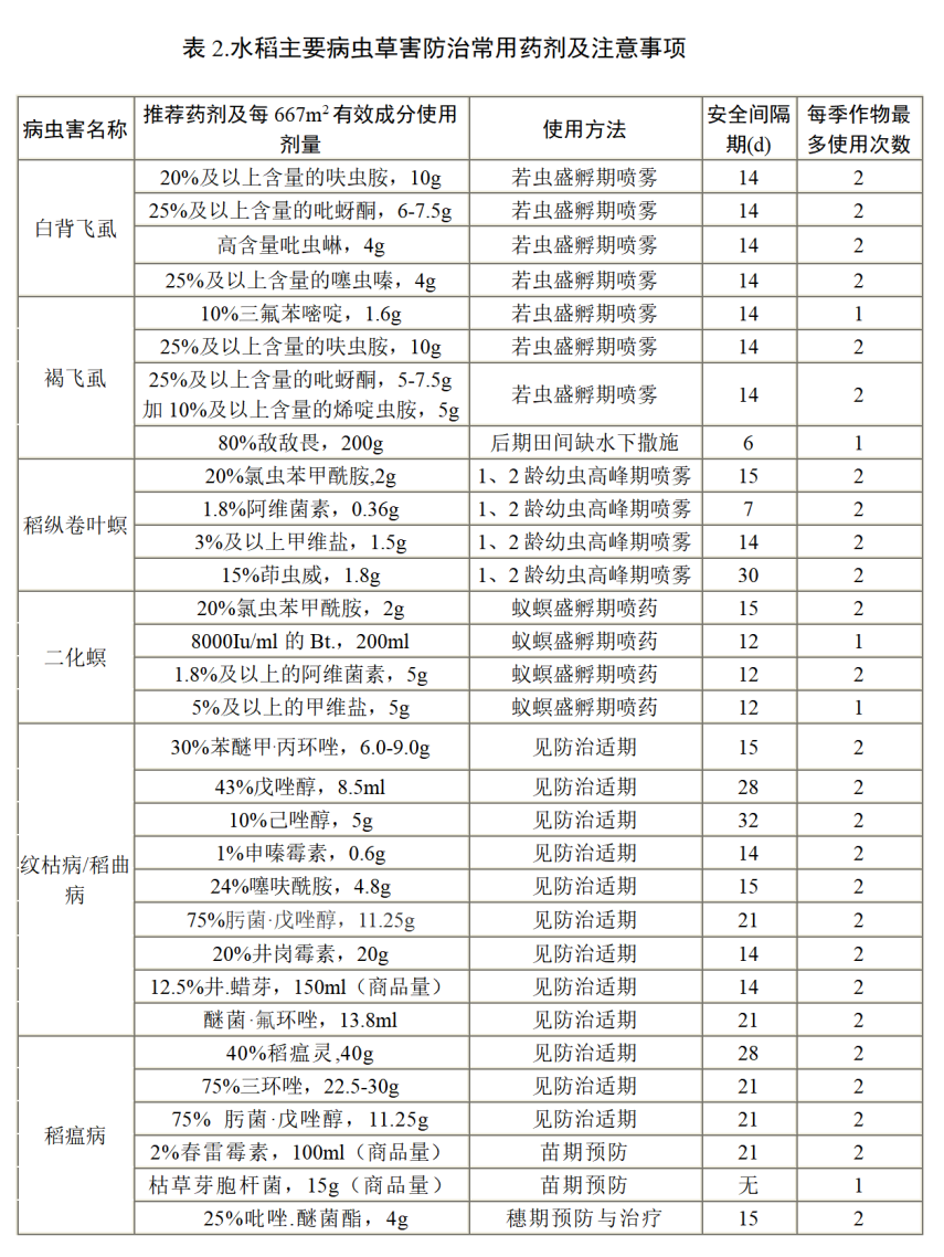 加强病虫监测,精准预报,在水稻主要病虫害的关键防治适期或达到防治指标时(表1),推广应用高效低风险绿色农药,集中开展专业化统防统治,提倡不同作用机理药剂合理轮用与混配,避免长期、单一使用同一药剂。严格按照农药使用操作规程用药(表2),遵守农药安全间隔期,确保稻米质量安全。提倡使用高含量单剂,避免使用低含量复配剂。禁止使用含拟除虫菊酯类成分的农药,谨慎使用有机磷类农药,尽量应用阿维菌素、三氟苯嘧啶等环境友好型农药。